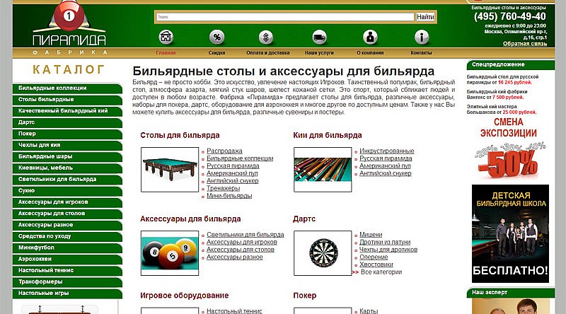 Интернет-магазин бильярдных столов и аксессуаровShop script 2012Теги: составные товары и вариации, создание парсера, система купонов, замена хостинга, водяной знак, seo