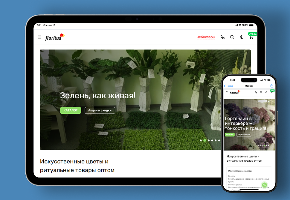 Floritus — компания, специализирующаяся на оптовых поставках искусственных цветов и флористики для декора. В отличие от розничных цветочных магазинов, их целевая аудитория — это B2B-клиенты: дизайнеры интерьеров, event-агентства, декораторы и корпоративные заказчики. Основная цель бизнеса — стать узнаваемым лидером в своей нише и увеличить объем оптовых продаж через онлайн-канал.