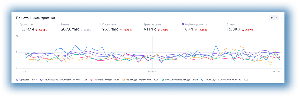 Отличные поведенческие показатели: Пользователи проводят на сайте в среднем около 6 минут, просматривая более 6 страниц за визит, что говорит о высоком интересе и вовлеченности целевой B2B-аудитории. Низкий процент отказов подтверждает качество трафика и удобство сайта.
