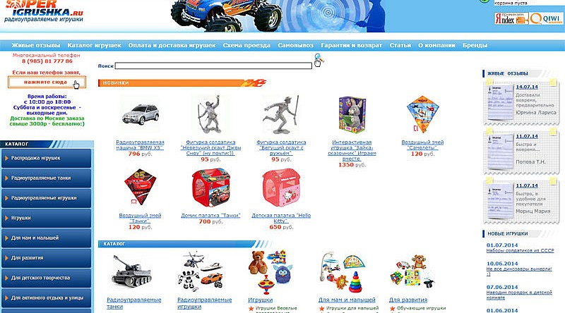 Интернет-магазин Супер игрушка - продажа радиоуправляемых моделейСамописный 2008Теги: seo, автоматизация обработки заказов, генерация ЧПУ, загрузка прайсов поставщиков, оформление заказа, поиск по сайту, редактор контента