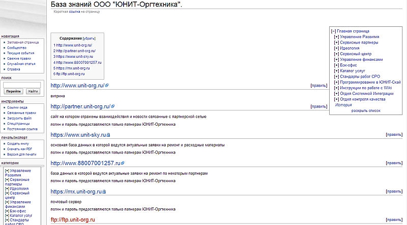 ЮНИТ-Оргтехника - сервисное обслуживание офисной печатиMediaWiki 2012Теги: разграничение прав доступа, редактор контента, генерация PDF, импорт/экспорт в Excel
